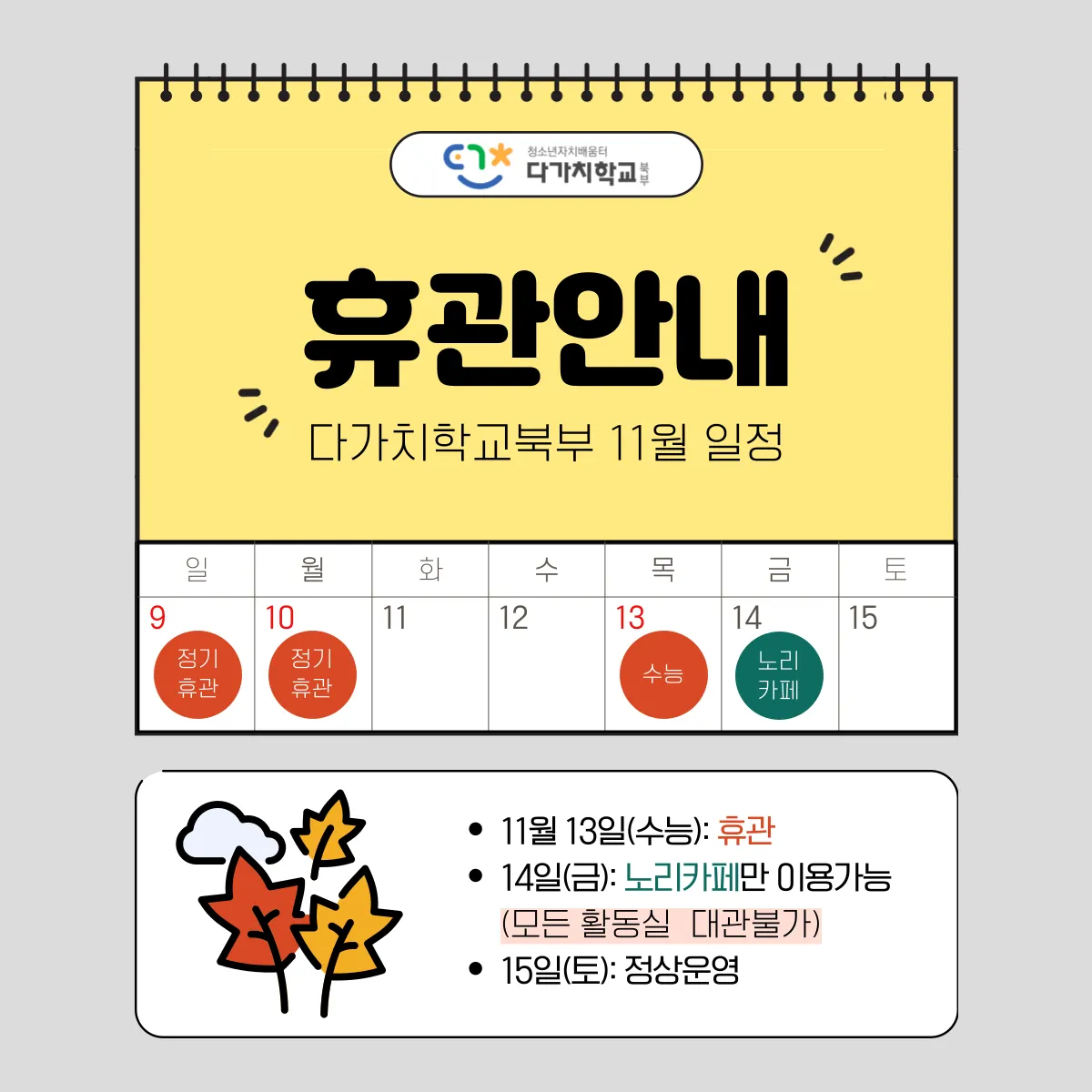 11월 14일(금): 노리카페만 이용가능 (모든 활동실 대관불가)
