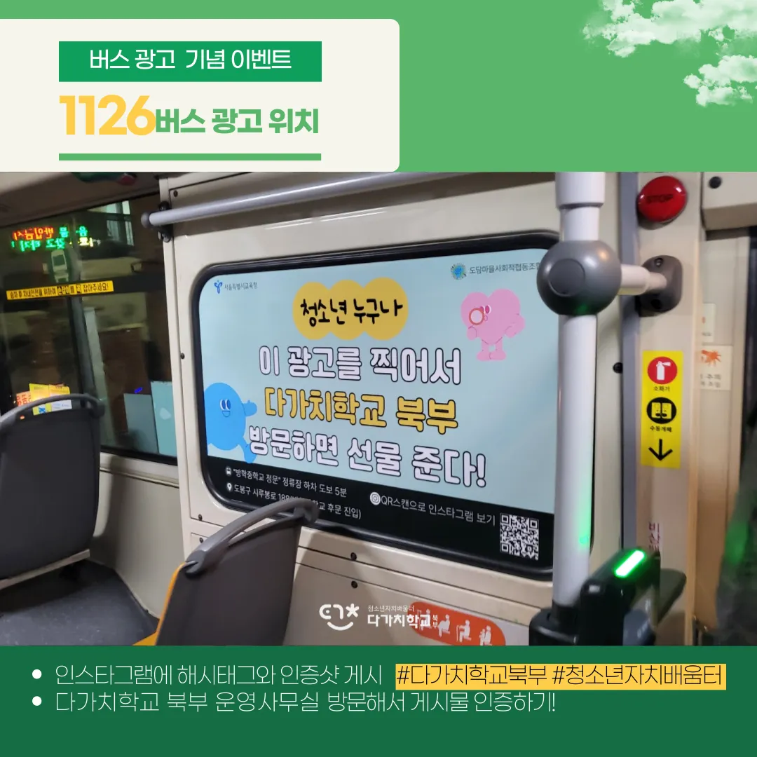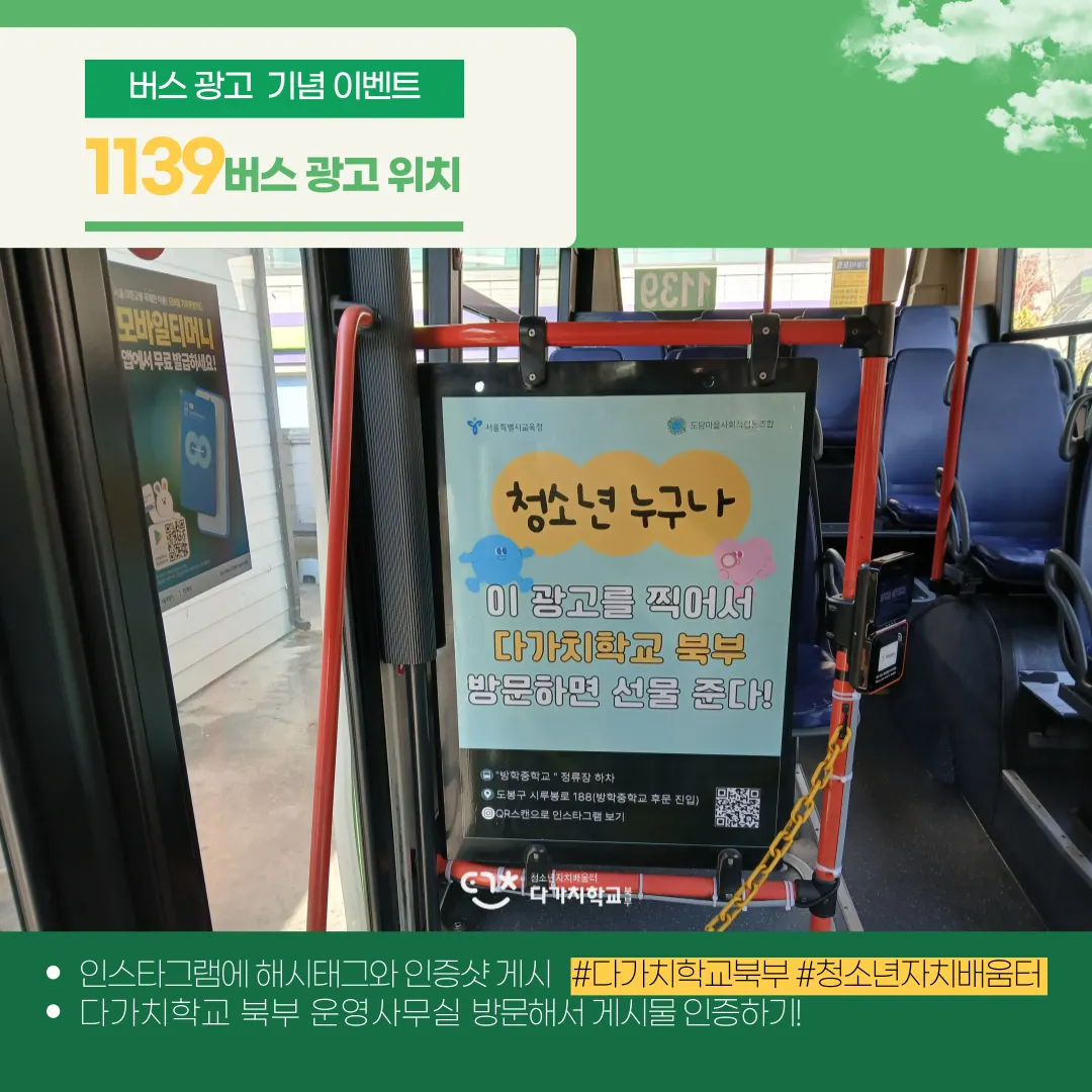 1126, 1139 버스 내부에 부착된 다가치학교 북부 광고 촬영하기