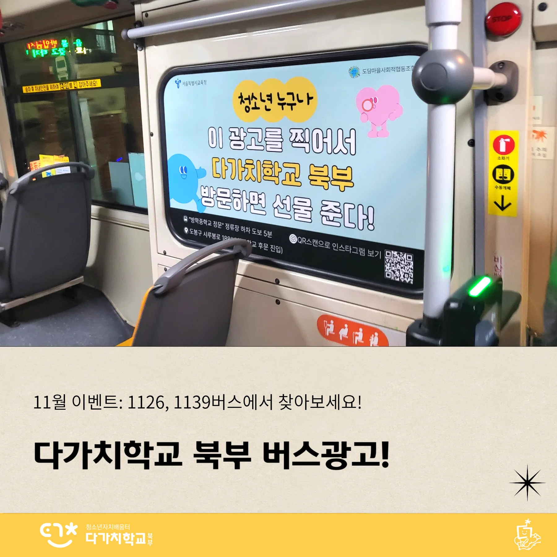 다가치학교 북부 버스광고: 1126, 1139버스에서 찾아보세요!