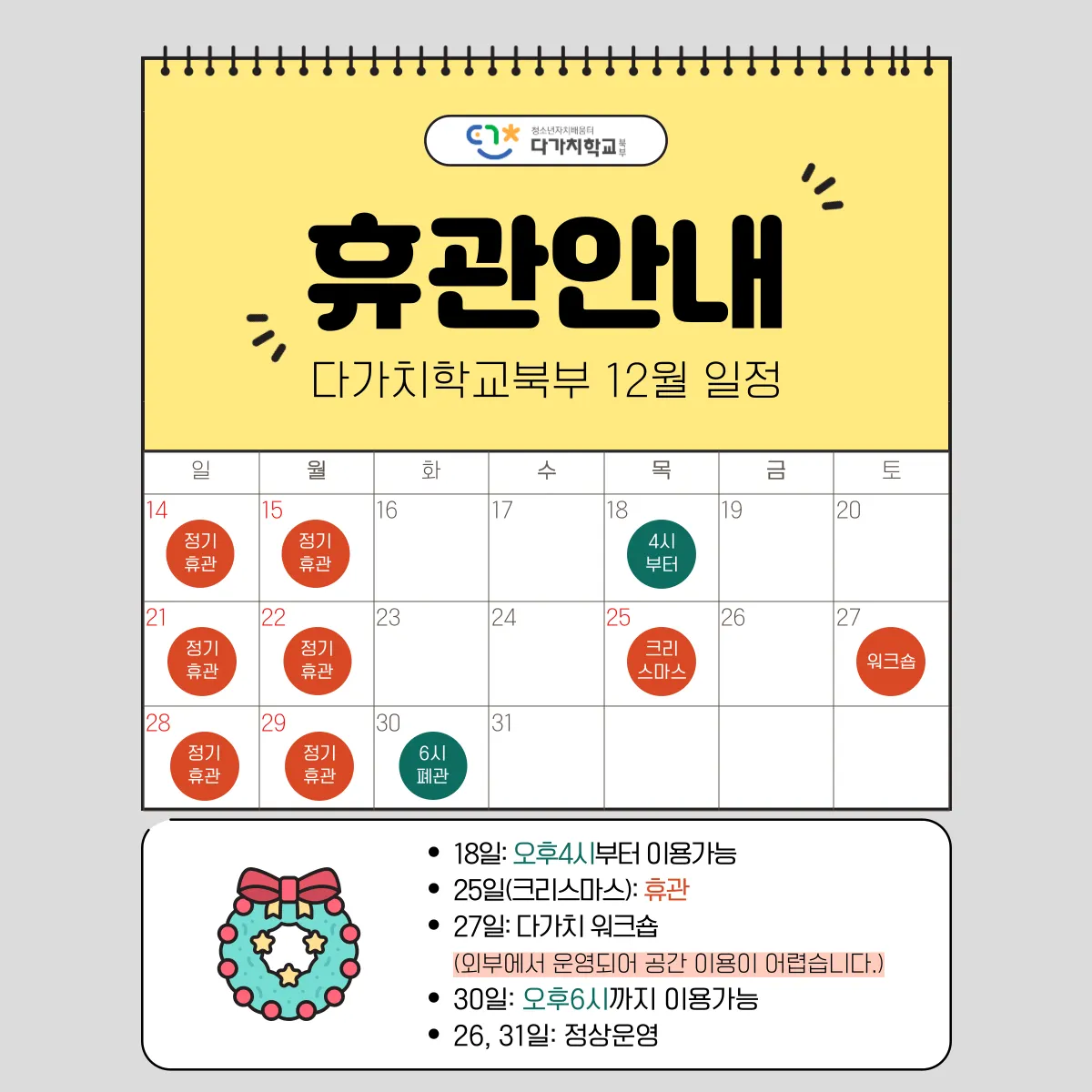 다가치학교 북부! 12월의 운영일정을 확인하고 방문에 참고해주세요!