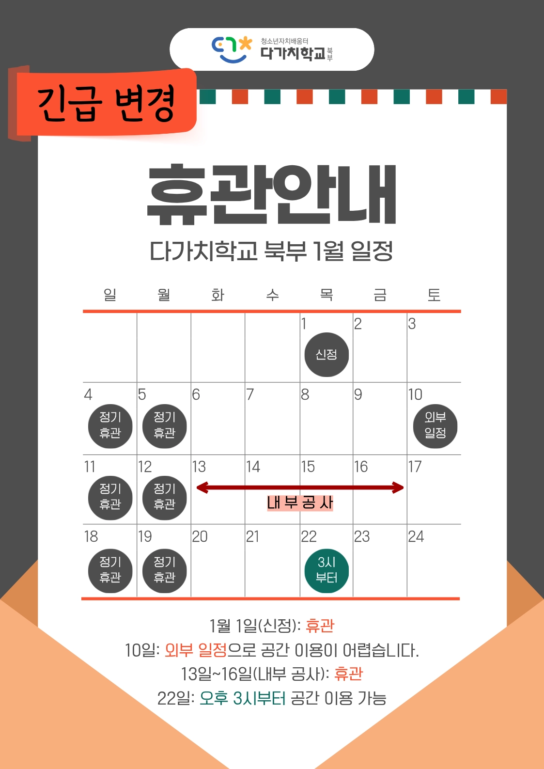 내부 공사로 인해서 1월 운영일정에 변동이 있습니다. 확인하고 방문에 참고해주세요!