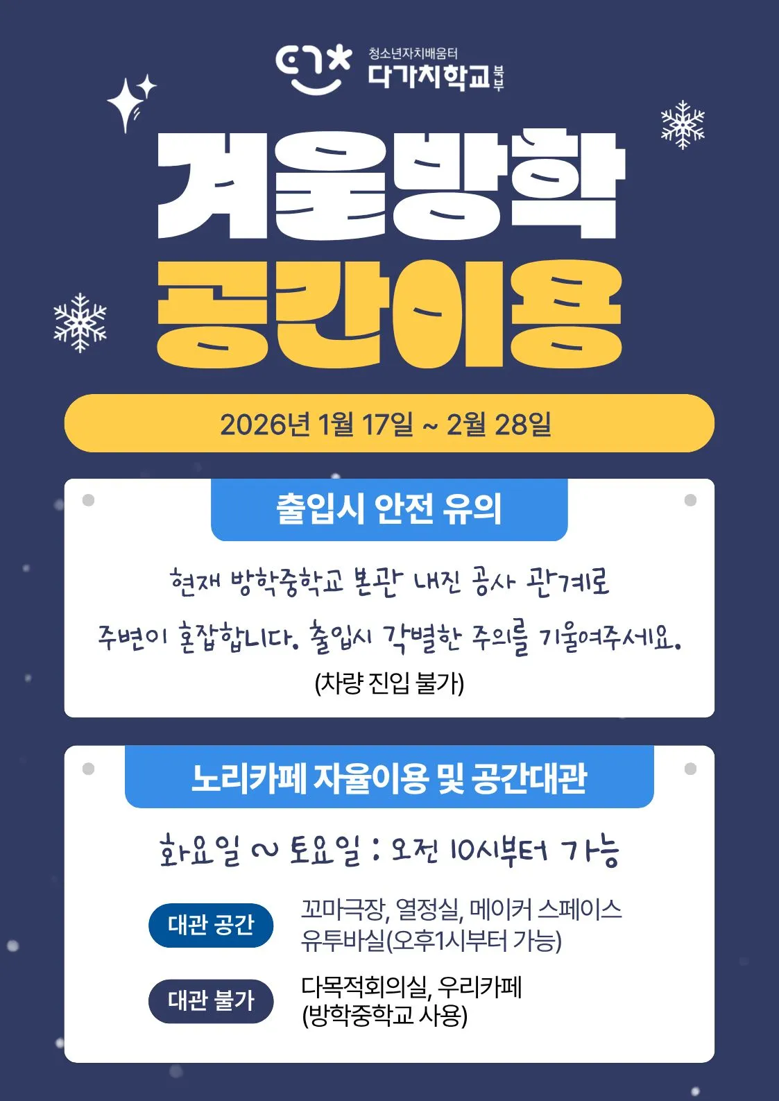 겨울방학 기간 동안 공간 이용 관련 안내사항을 전달합니다.