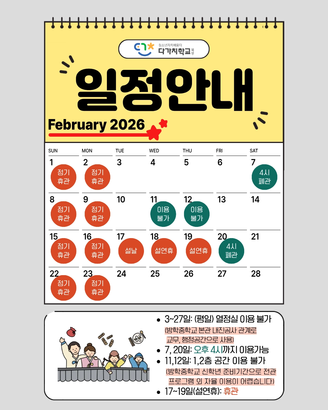 다가치학교 북부! 2월의 운영일정을 확인하고 방문에 참고해주세요!