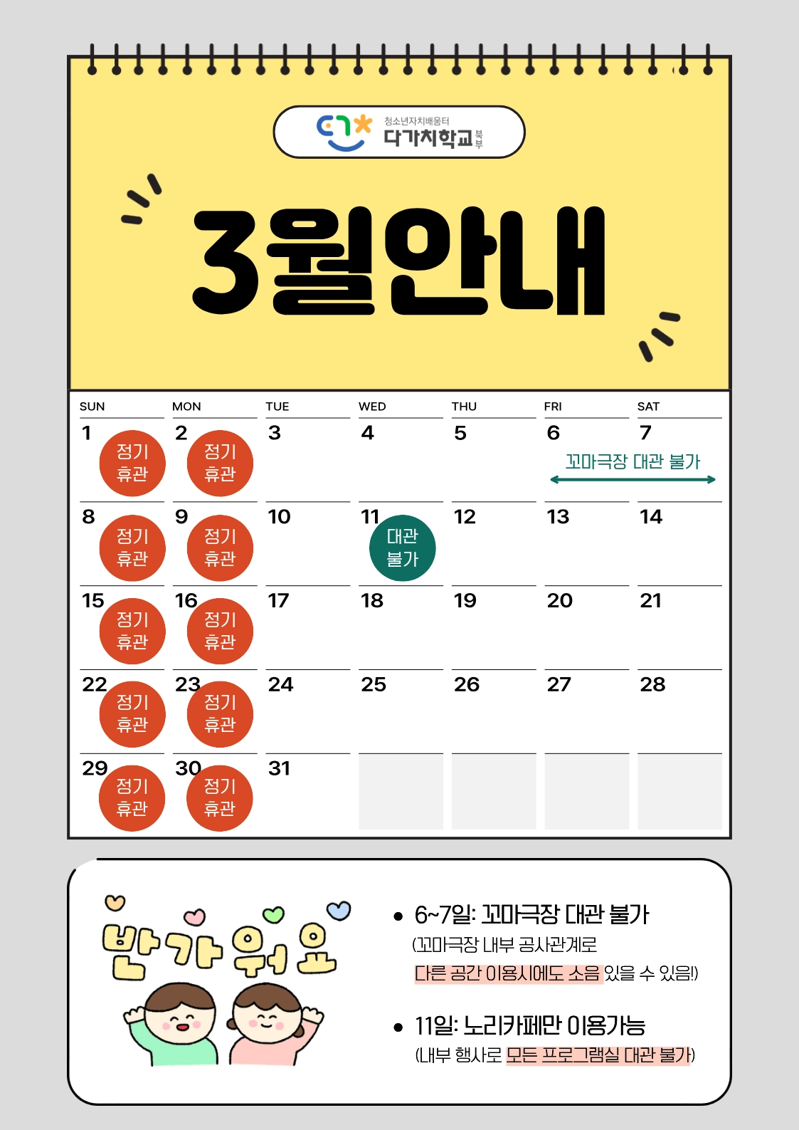 다가치학교 북부! 3월의 운영일정을 확인하고 방문에 참고해주세요!